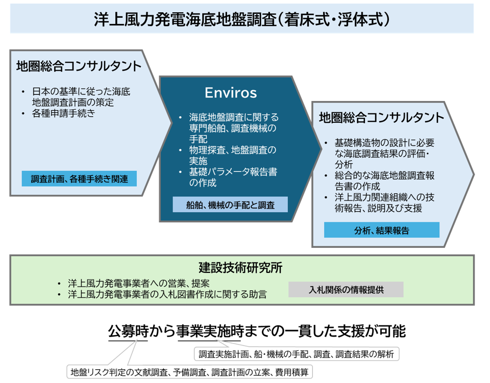 当社と建設技術研究所、およびEnvirosが連携することで、わが国で今後展開拡大が見込まれる洋上風力発電事業において、海底地盤調査分野への市場参入を目指します。